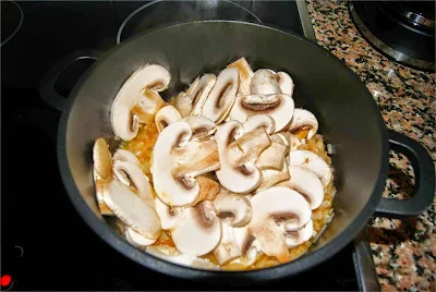 Rallamos los tomates y los incorporamos a la cacerola removiendo muy bien. Laminamos los champiñones y hacemos lo mismo, dejando que se vayan cociendo un poco y suelten los jugos.